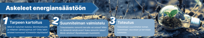 Tarvittaessa on hyvä hyödyntää asiantuntija-apua tarpeen selvittämiseen esimerkiksi tekemällä energiakartoitus, mikä ohjaa eteenpäin tulevien suunnitelmien kanssa.